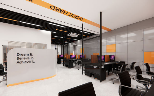The Osprey Shipping Office is located along the main road of Tuticorin Smart City, designed to accommodate a dynamic workforce of up to 35 staff members. The interior concept draws inspiration from the company’s identity — with orange, the signature colour of Osprey Groups, used as a vibrant highlighter throughout the workspace. This is balanced with a clean palette of grey and white, creating a bright, energetic, yet professional environment.